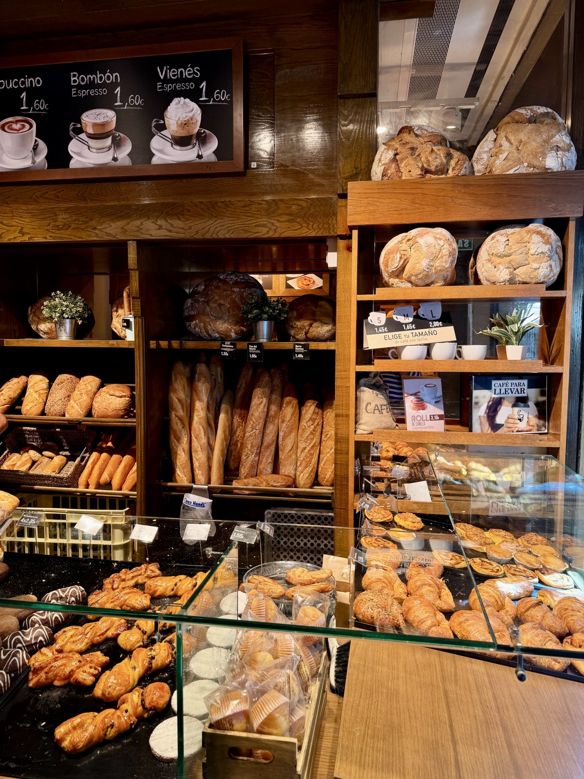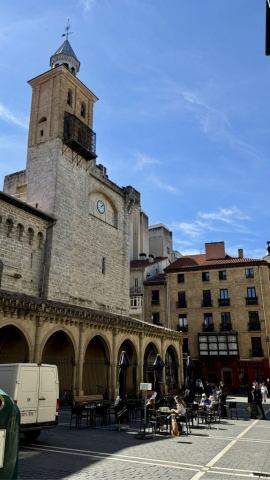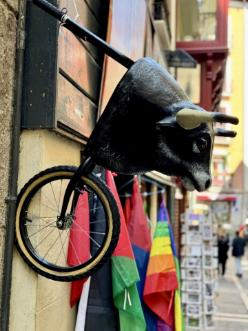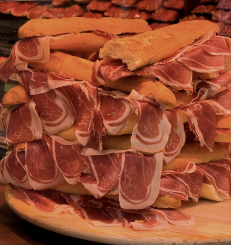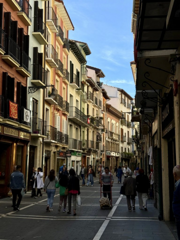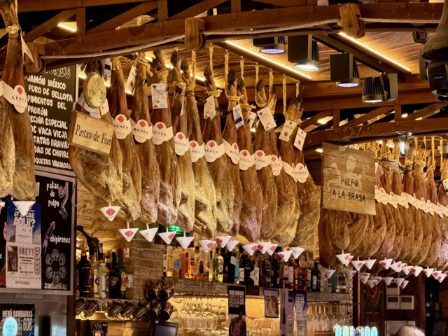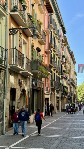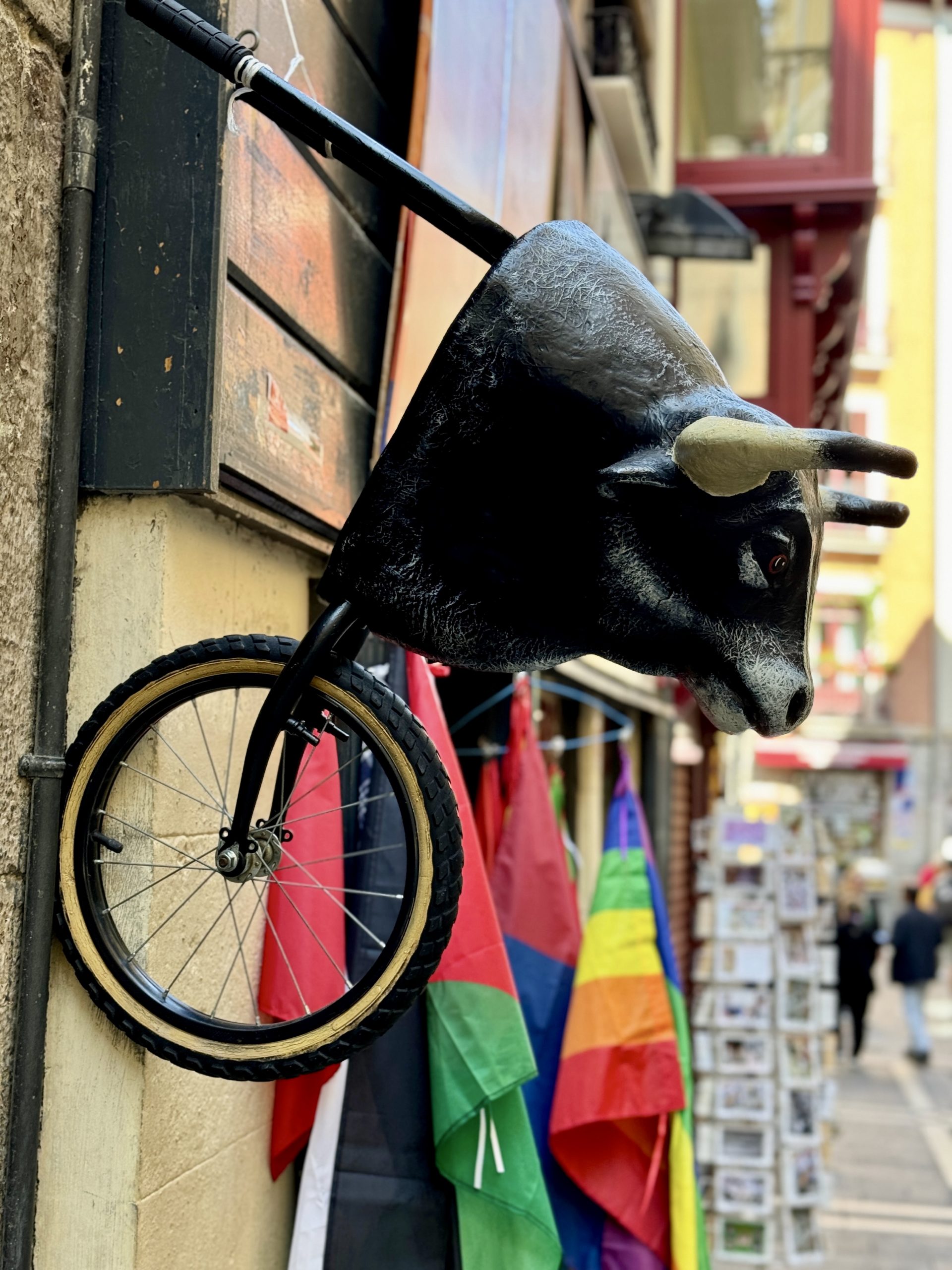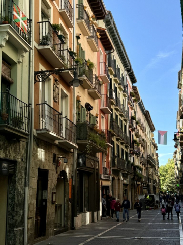 Umgeben wird der Platz von bunten und reich verzierten Häusern mit schmiedeeisernen Balkonen und Holz-Klappläden. Von hier aus geht ein unüberschaubares Gewirr an Gassen und kleinen Straßen in alle Himmelsrichtungen. Wir schlendern durch die engen Gassen, gesäumt von kleinen Geschäften und Tapas-Bars, in denen der Serrano von den Decken hängt.