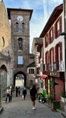 Wir besichtigen noch die Kirche Notre-Dame-du-Boût-du Pont und zünden das obligatorische Kerzlein an. Ihr Glockenturm ist zugleich Stadttor an der Brücke über die Nive de Béréhobie.